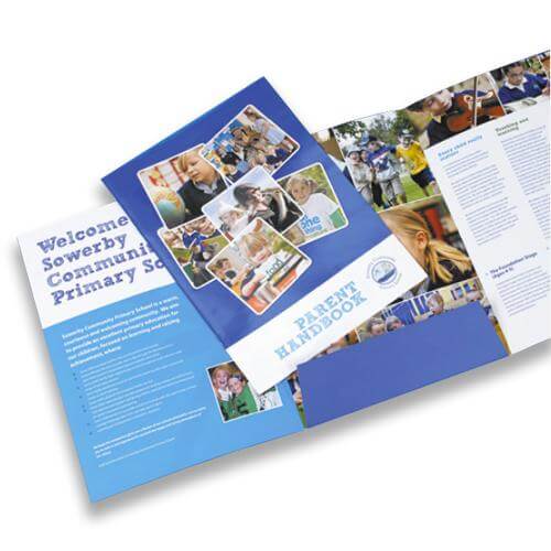 Oversize A4 with full colour on one, or both sides. Matt laminate outside.